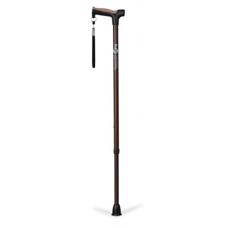 Ergonomic cane with cushion-top handle, shock-absorbing tip, and 12 height settings for users 5′ to 6’5″. Offers comfort, stability, and extra traction.